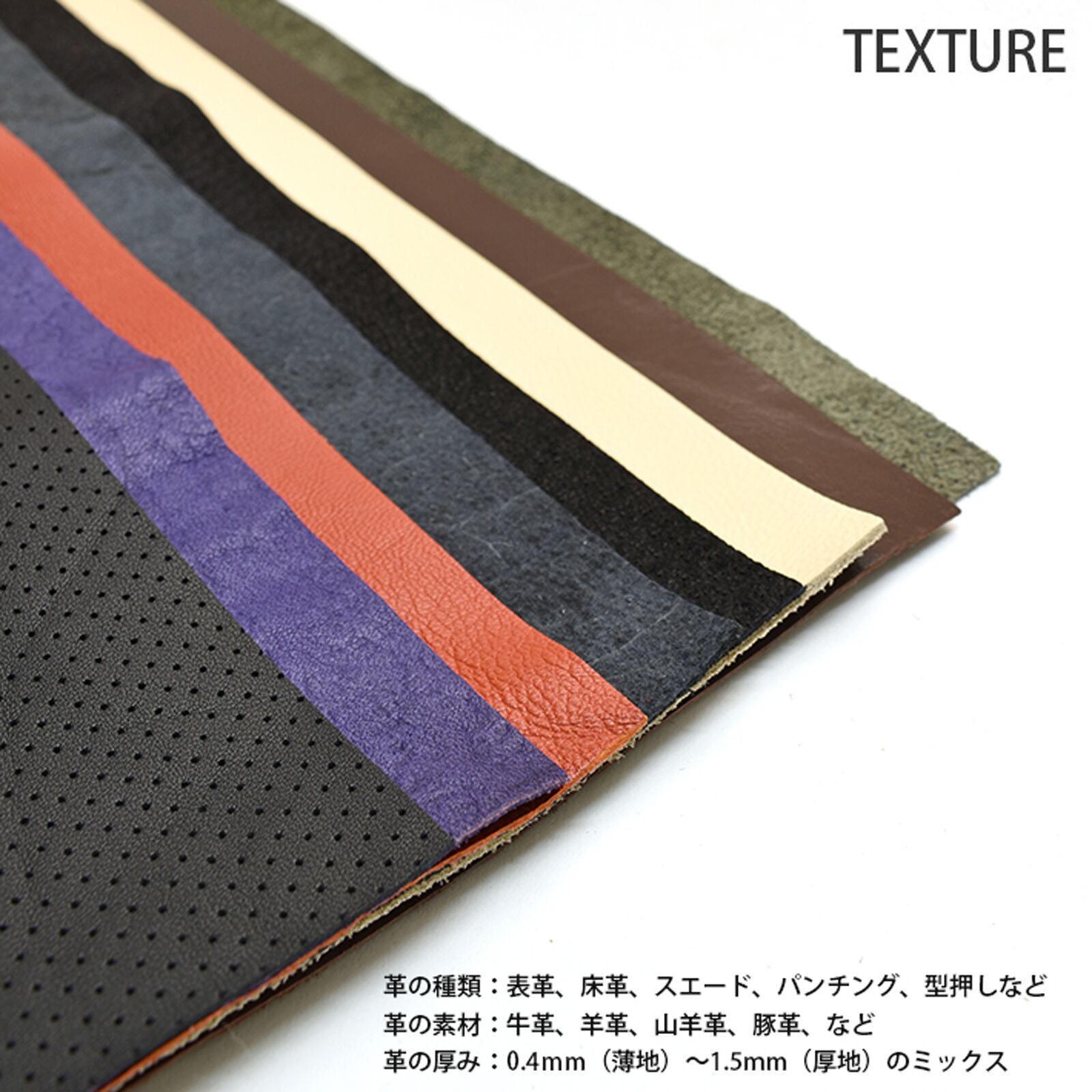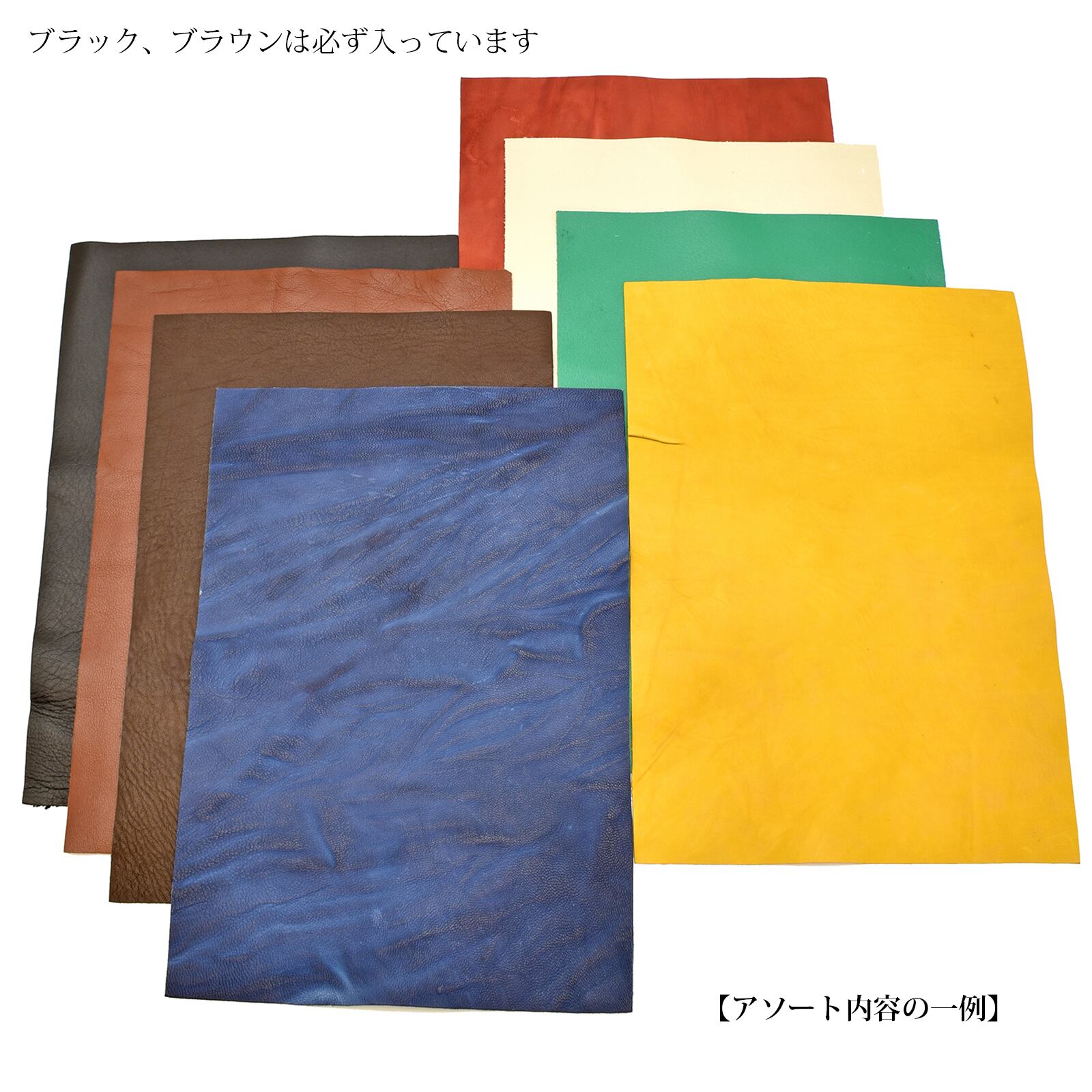 レザークラフト用の革はぎれを袋詰めしたアソートお得な商品です。レザークラフト入門用や、革小物を製作される方にもどうぞ。